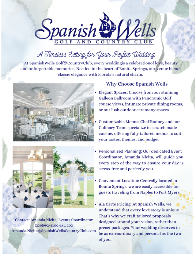Paired with our attention to detail, active responsiveness, experience, and organization skills you’ll be glad you decided on us. When selecting Spanish Wells Golf & Country Club, you’re not only selecting just a venue space, you’re selecting the place where you begin your lives together.